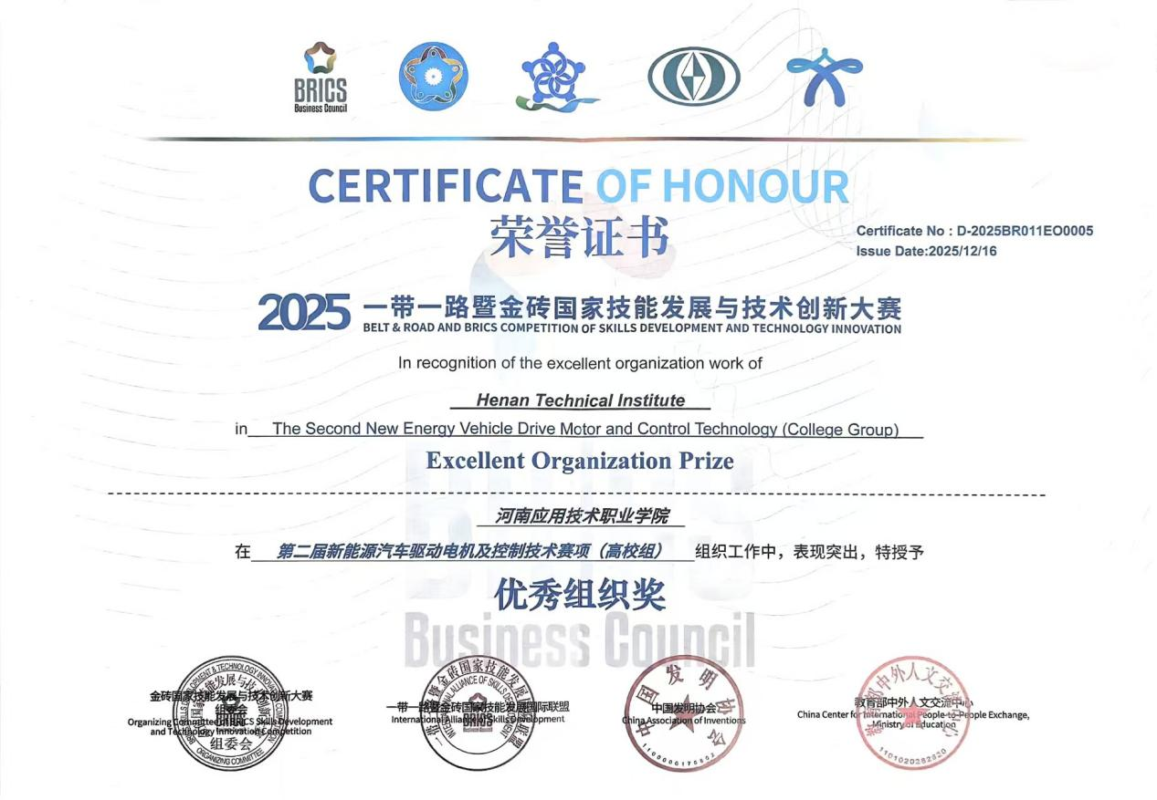 2025年12月11日-13日在安徽举办的2025年一带一路暨金砖国家技能发展与技术创新大赛—第二届新能源汽车驱动电机及控制技术赛项决赛中,公司bw西汉姆联师生团队凭借精湛技艺与稳定发挥,从全国266支强劲队伍中脱颖而出,荣获国赛二等奖、三等奖各一项,公司同时获评“优秀组织奖”。该赛事作为深化“一带一路”与金砖国家间技能发展与创新合作的重要平台,对推动新能源汽车领域国际技术交流、标准化人才培养具有深远意义。
