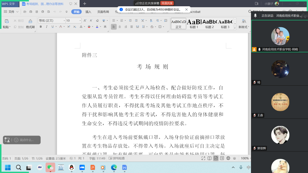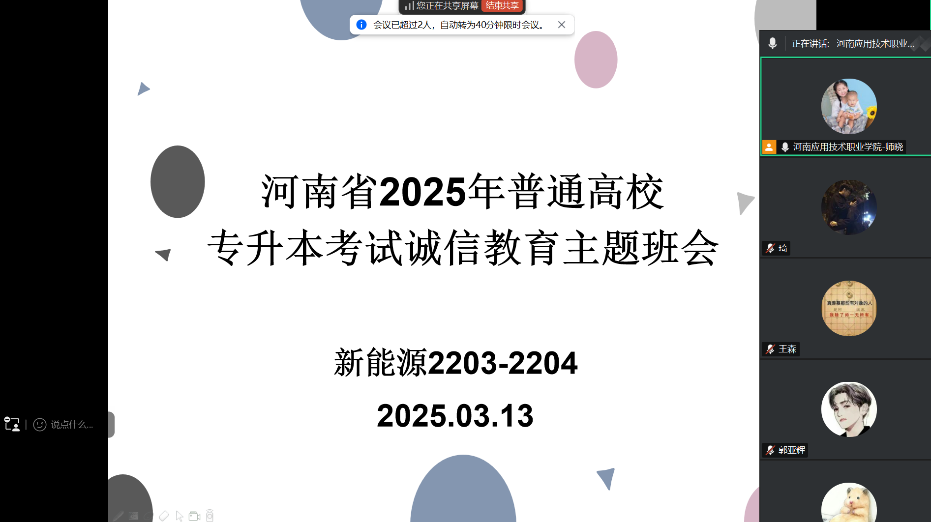 为深入贯彻落实国家教育考试相关规定,强化专升本考生诚信意识,保障考试公平公正,bw西汉姆联于3月13组织全体专升本考生召开“诚信应考·笃行致远”主题班会。考虑到专升本考生正处于紧张备考状态,本次班会决定采取线上形式开展。会议围绕考试纪律、物品准备及“无声入场”规范展开全方位指导,全体考生在线参会,确保考前准备“零疏漏”、诚信教育“全覆盖”。